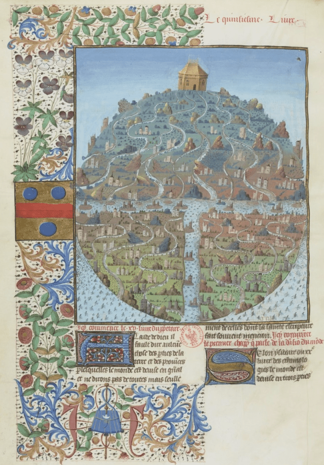 T-O-map (orbis tripartitus), illumination by Evrard d’Espinque for Jean Borbechon’s French translation of Bartholomaeus Anglicus‘ Liber de Proprietatibus Rerum of 1235, c.1480.